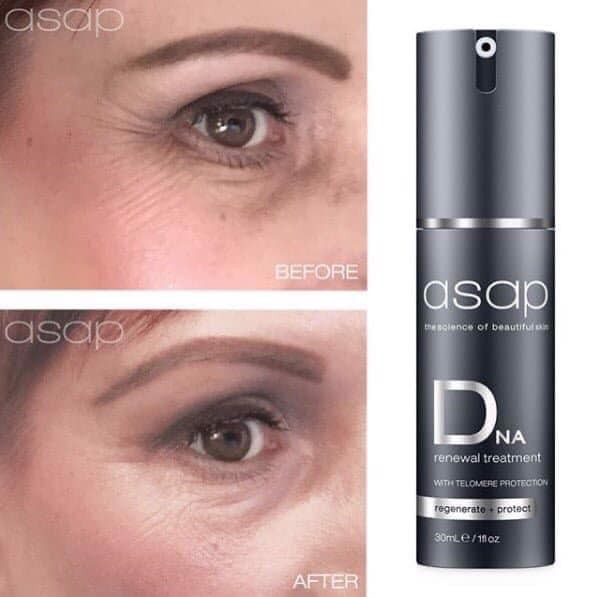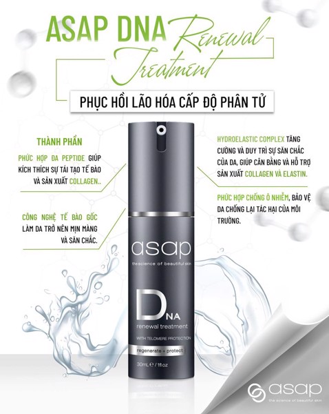 Asap DNA Renewal Treatment – được thiết kế đặc biệt để hỗ trợ sửa chữa các tế bào bị hư tổn và bảo vệ các telomere, cung cấp hàng rào bảo vệ liên tục và chống lại sự suy thoái tế bào. Hợp chất chống nhiễm khuẩn giúp khôi phục và bảo vệ da.Tăng cường độ đàn hồi của da bằng cách tăng cường sự ngậm nước cho da. Phức hợp Multi-Peptide bảo vệ và hoạt hoá các DNA tự nhiên kích thích quá trình phân bào tại các nếp nhăn, rạn, làm giảm nhăn và các dấu hiệu lão hoá có thể nhìn thấy bằng mắt thường.